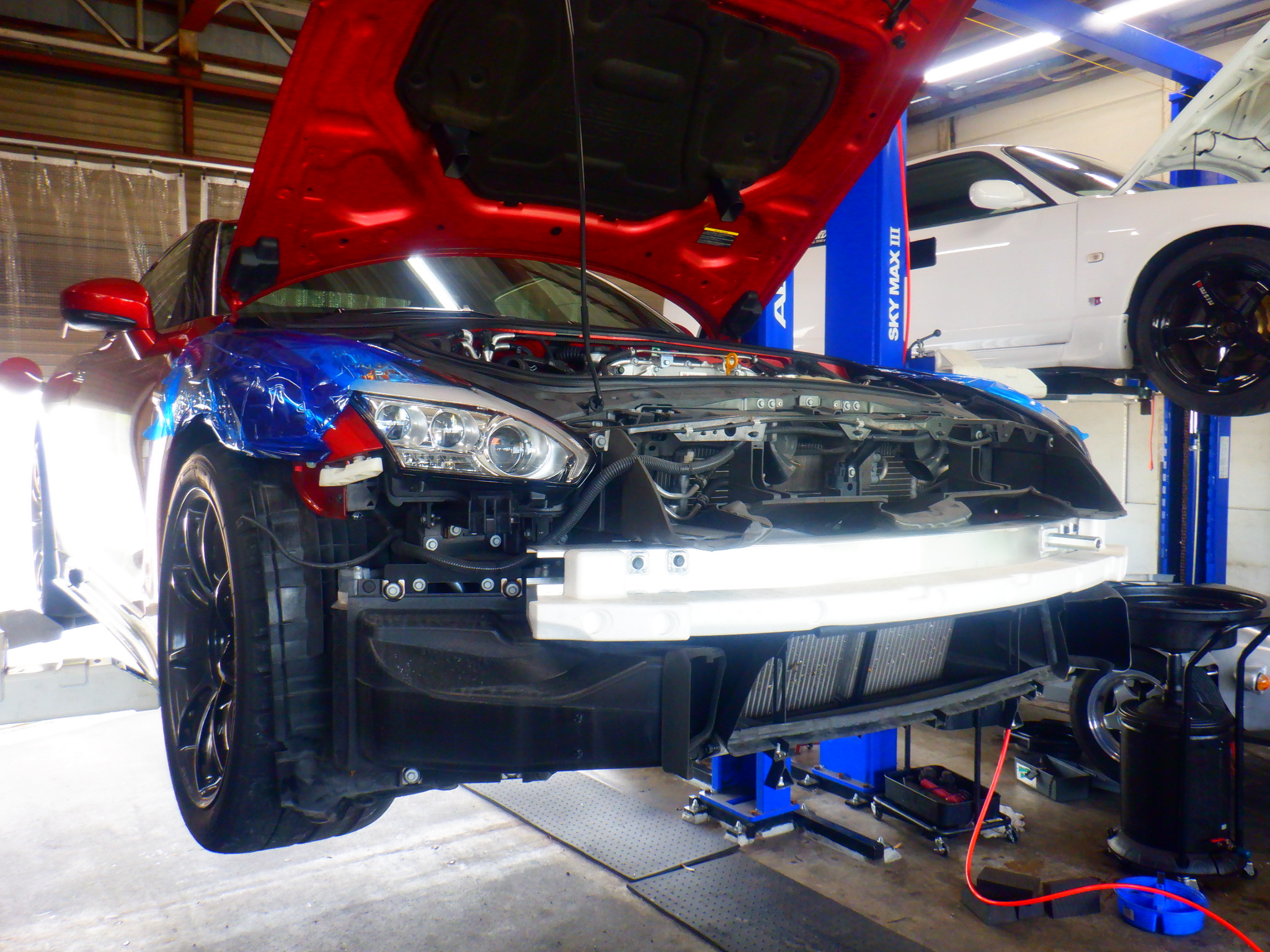 RZ34 Central20 フロントカーボンスポイラー 取付 & アライメント調整 & 車高調 仕様変更 & R35 DCTクーラー オイル漏れ