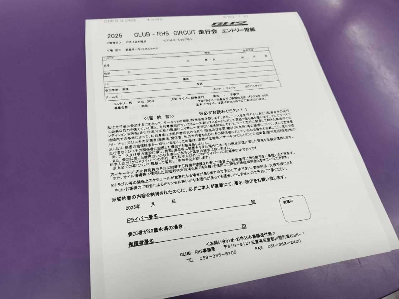今年のRH9鈴鹿サーキット走行会のエントリー用紙が届きました