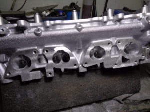 まずは燃焼室加工ですが、SR20はノッキングが出やすいのでブースト圧2キロ以上かける場合、本当はフルスキッシュカットしますが、ドラッグガスを使用しているのでトルクを出す為、今回はIN側のみのカットです