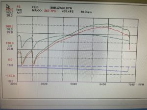 結果は401馬力と暑い時期にしては良い結果でしたが、マフラーの抜けが良すぎるのか?ブースト圧が引きずって1,3キロまで上がっちゃいます