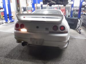 OS技研シーケンシャルミッションを載せた愛媛県IさんBCNR33は、インジケーターの配線処理してバックランプの点灯確認OK