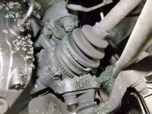 点検しながら作業を進めましたが、フロントドライブシャフトブーツが爆発していたり、ショックからオイル漏れていたり・・・frown