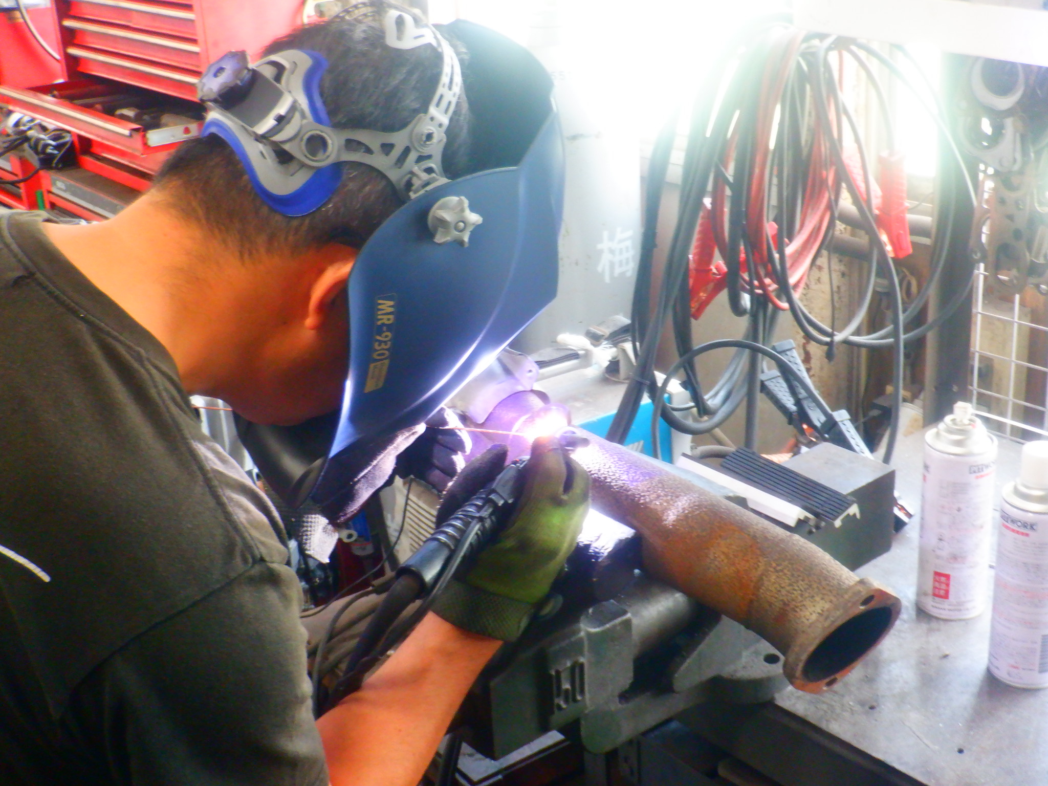 先にセンサーボスを溶接し・・・