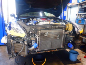 明石市T様R35は、オリジナルラジエターの取り付けを進めていきます