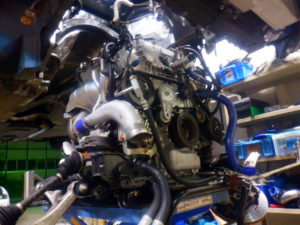 さて、大阪府I様R35の水漏れ点検ですが、エンジン搭載状態では何とも分からないので?降ろしてチェックします