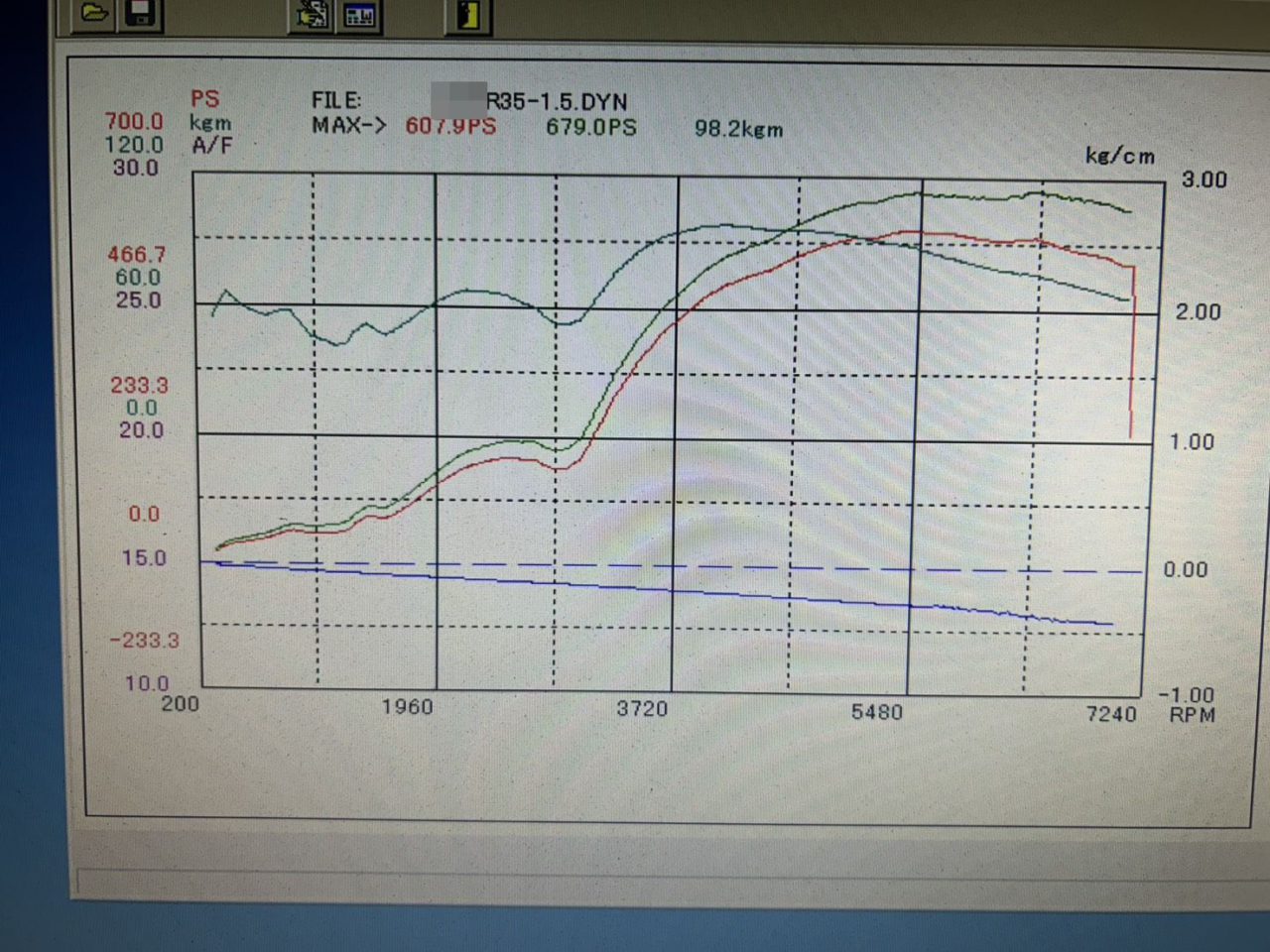 徐々にブースト圧を上げていき、最終150kPaで約680馬力&トルク100キロ出ました![]()