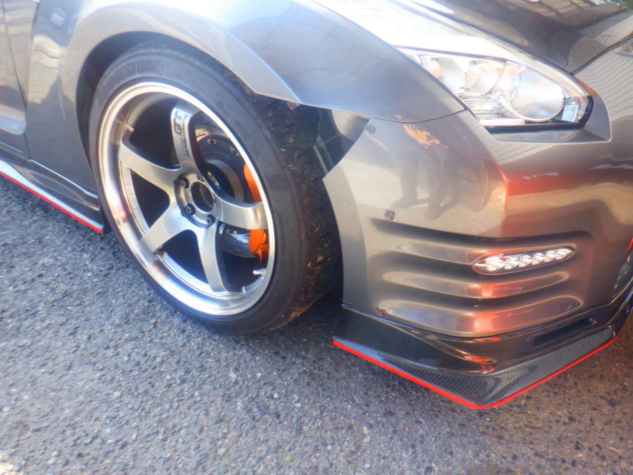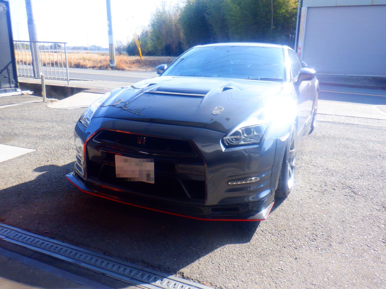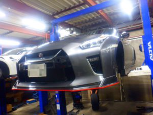 パスタ様R35は年末の岡国で割れてしまったエアロパーツの補修で入庫しました