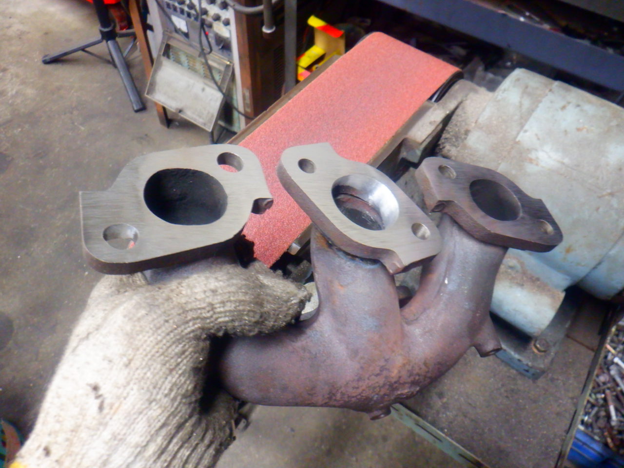 加工したRB25ツインターボ用のエキマニは、歪み取りで面研